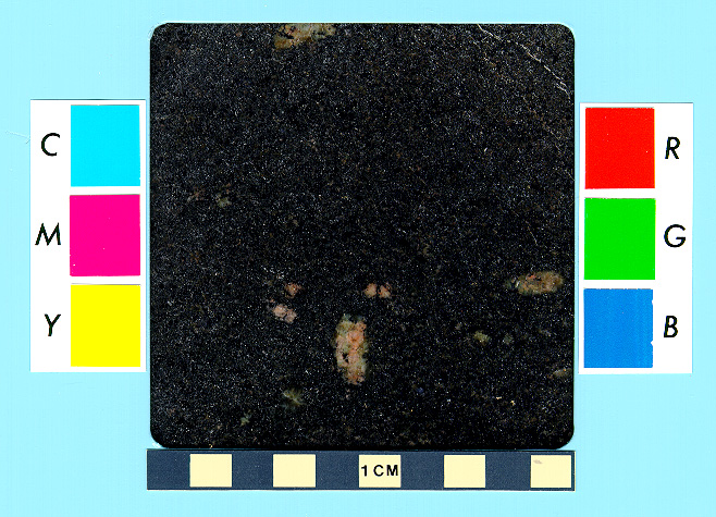 (c) mottled light gray, dark green and greenish black, coarse-grained. PHOTO: sample 1