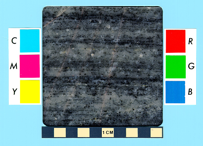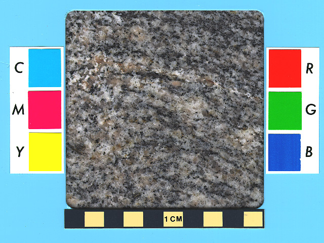 (b) mottled light gray and moderate green, medium-grained. PHOTO: sample 1