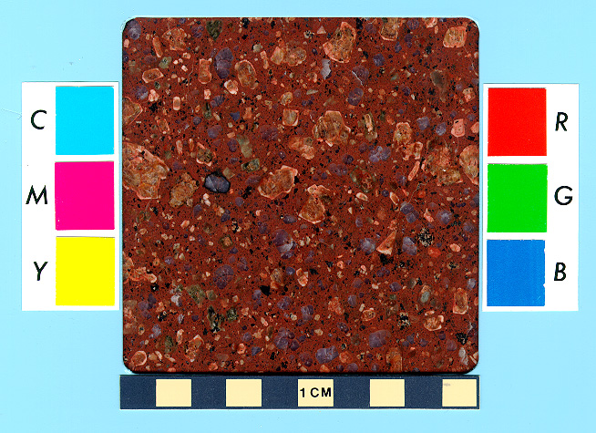 (a) reddish-purple aphanitic groundmass, and pale pink and/or white phenocrysts (up to 3 mm) [= the "Imperial Porphyry"].