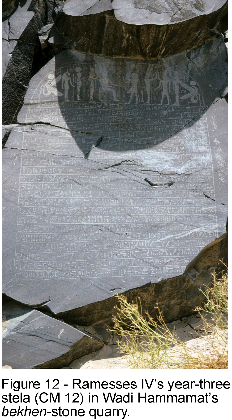 The map was made about 1150 BC by the well-known ‘Scribe of the Tomb‘ Amennakhte, son of Ipuy (Figure 11). It was prepared for one of the quarrying expeditions sent to Wadi Hammamat by king Ramesses IV (1156-1150 BC) of the New Kingdom’s 20th Dynasty. The purpose of these expeditions was to obtain blocks of bekhen-stone that would be carved into statues of the gods, king and other notables. A now famous rock-cut inscription or stela (officially designated CM 12) was left on the quarry wall by this king to commemorate his final and largest expedition during the third year of his six-year reign (Figure 12). According to the inscription, this included 8,362 men, which makes it the largest recorded quarrying expedition to Wadi Hammamat after one about 800 years earlier during the Middle Kingdom’s 12th Dynasty. It is almost certainly for Ramesses IV’s big expedition that the map was made, but what purpose it served is unclear. It could not have been a road map showing the way to the quarry because it only covers a small area with the 75 km between Wadi Hammamat and the Nile Valley excluded. Most likely, it was drawn as a visual record of the expedition to be viewed by either Ramesses IV or Ramessenakhte, the High Priest of Amun in Thebes, who organized the expedition for the king.