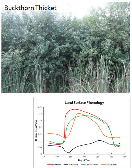 A temporal analysis of land cover in Irwin Prarie covering 2000-2010 was conducted using LIDAR, Landsat ETM+ and air photo data to map buckthorn thicket location and extent. Differences in the phenological cycles and canopy structure of buckthorn thicket, pin oak savanna, and twig rush prairie were used to distinguish land cover.