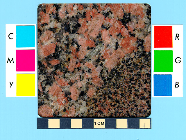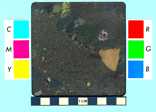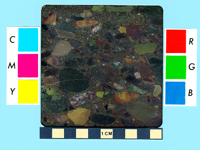 (b) mottled light gray and moderate green, medium-grained. PHOTO: sample 1