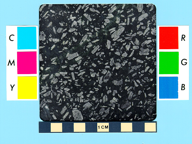 Dolerite porphyry: slightly greenish overall but with black aphanitic groundmass and medium gray phenocrysts (up to 15 mm) [Tertiary dike cutting Precambrian basement].