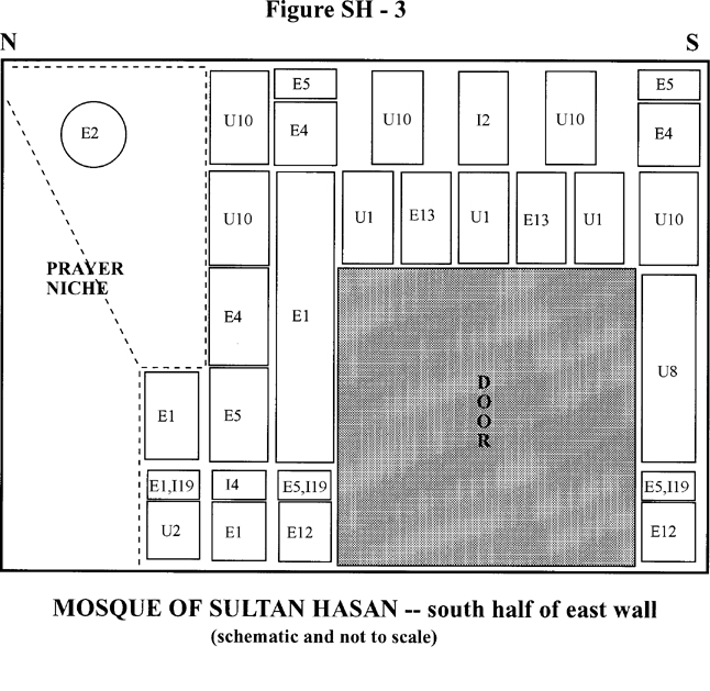 Qibli liwan east wall (see Figures SH-2 and SH-3): panels of MP red and greenish black porphyries, WB quartz diorite, WUS diorite, Aswan granodiorite, WH graywacke, banded travertine, verde antico, astracane dorato (d'Egitto?), broccatelli d'Egitto?, bianco e nero antico, pavonazzetto, cipollino rosso brecciato, bigio antico, mottled pink limestone/marble, and swirled yellow/pink limestone [U8].